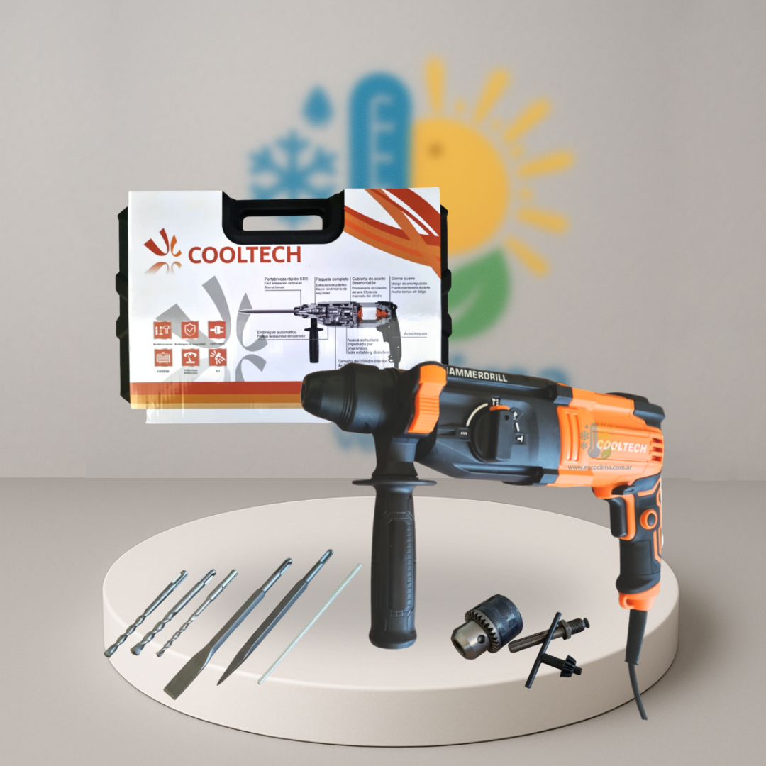 Taladro Cooltech HM-LN2603 de alto rendimiento, ideal para perforar, atornillar y cincelar materiales duros como concreto, madera y metal. Perfecto para instalaciones de aire acondicionado, calefacción, plomería, electricidad y ventilación, con control de vibración para trabajos prolongados y arranque preciso gracias al gatillo con reversa.