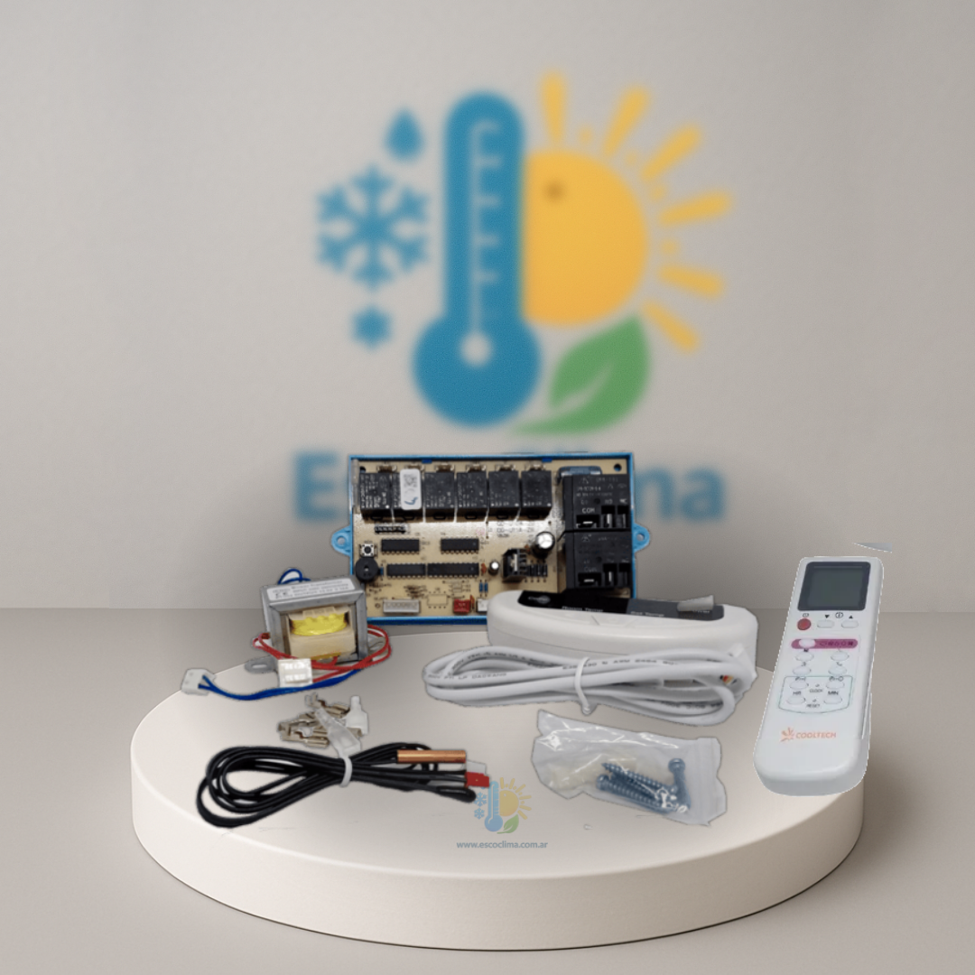 Plaqueta universal para aires acondicionados tipo piso-techo con display digital, compatible con múltiples marcas y modelos de sistemas de frío y frío-calor. Permite un control preciso de los modos de trabajo y velocidad del ventilador, evitando corrientes de aire frío en modo calefacción.